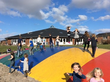 Vi har hallen nogle eftermiddage om ugen. Vi prioritere at bruge den meget – specielt i vinterhalvåret. Her er der god mulighed for bevægelse, og det er med til at give noget luft i SFO'en, fordi den trækker en del elever.