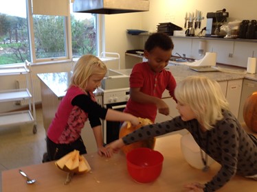 Skolekøkkenet ligger ved siden af SFO-lokalet. Derfor bruger vi det en del i SFO, som et ekstra lokale. Vi serverer også eftermiddagsmad i køkkenet hver dag. Her prøver vi også nogle gange at medinddrage børnene i at lave eftermiddagsmaden.